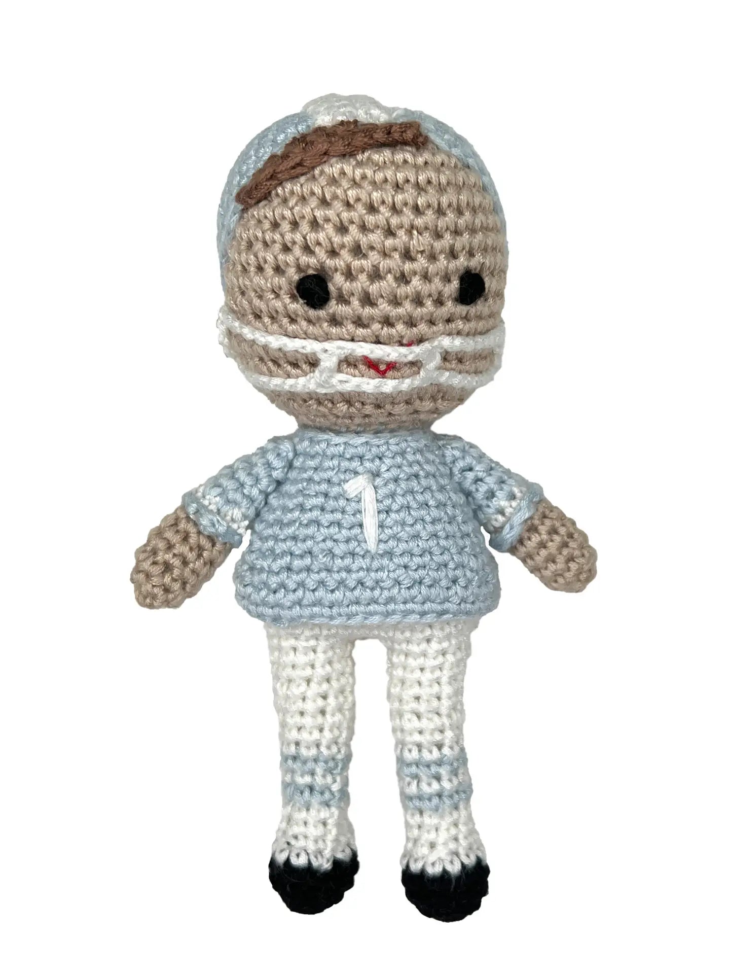 5" Light Blue Football Player Bamboo Crochet Rattle