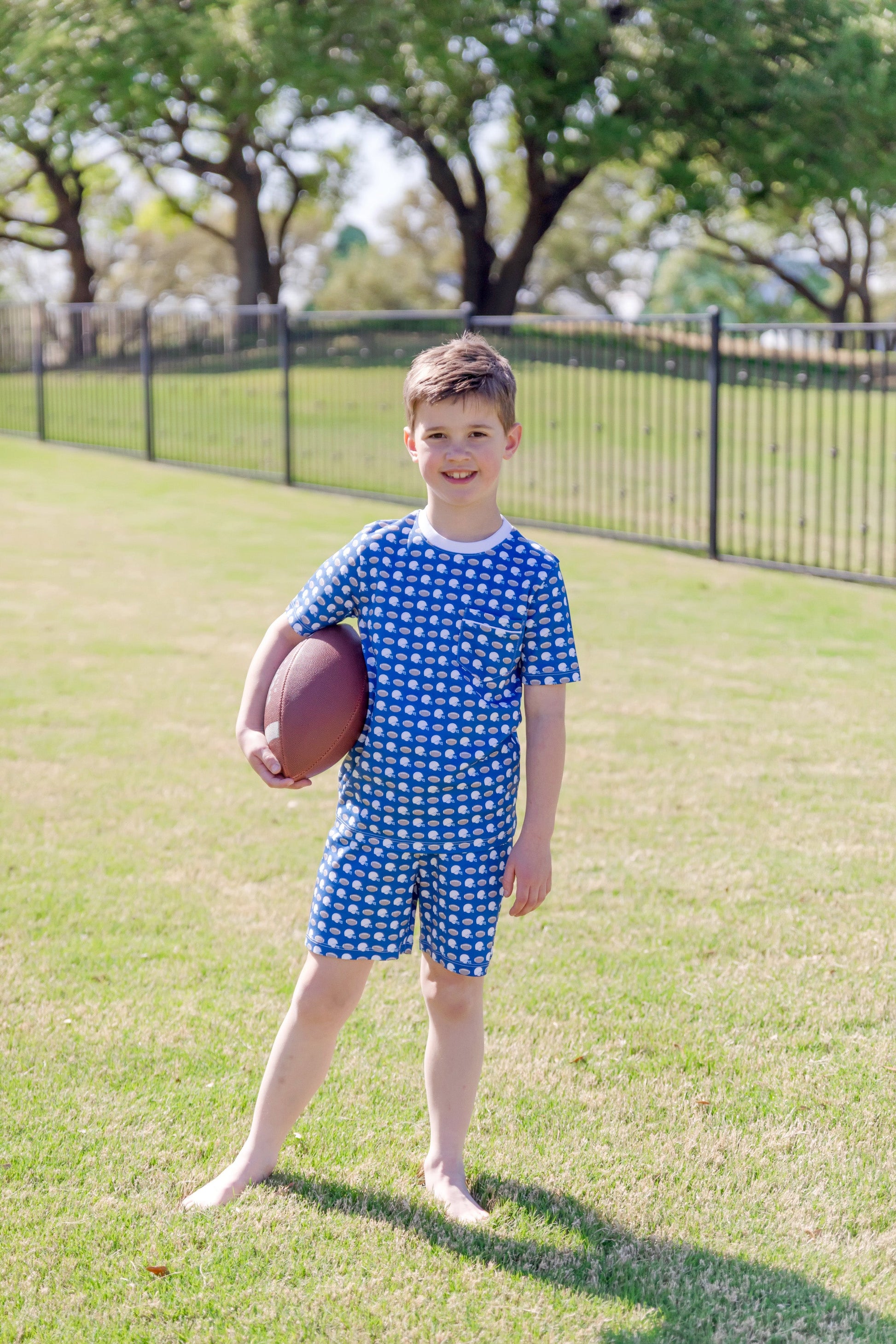 Pima cotton boys' pocket t-shirt and matching play shorts. Made from 100% Peruvian Pima Cotton. This item is not intended for sleepwear.