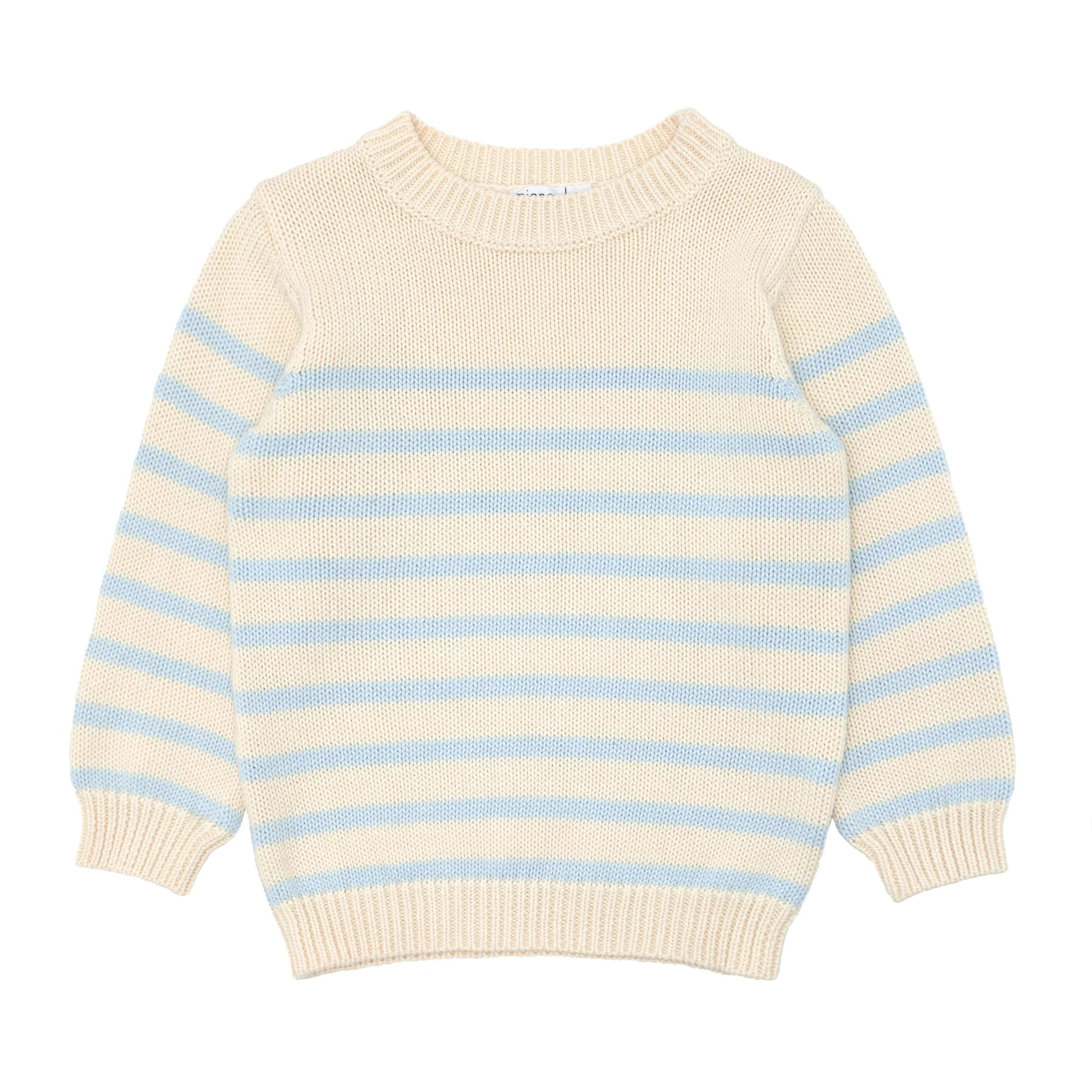 this cozy & ultra soft luxury knit sweater is the perfect apres swim piece to throw over your minnow suit year round. made from natural cotton fibers known for their breathability and absorbency. this special piece stands up to wear and tear without sacrificing comfort and features unique rib detailing throughout. now available in our light blue and cream stripe, it make a perfect pair pair with coordinating knit pants that your littles will never take off!