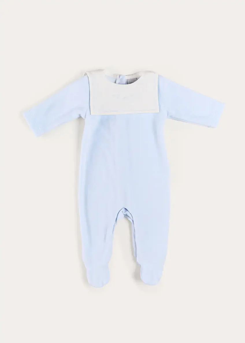 The Floral Detail Embroidered Collar Velour All In One in Blue is a cosy winter essential crafted from soft velour, featuring long sleeves with delicate frill cuffs and lace trims for a sweet, vintage touch. It boasts a charming lace frill neckline adorned with intricate floral embroidery, adding a gentle elegance to baby’s outfit. Designed for practicality and comfort, it includes built-in booties and poppers down the legs and back for effortless dressing and changing during chilly days.