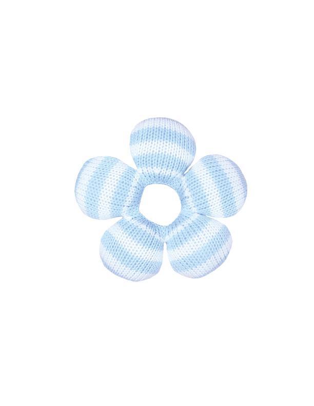 A hand knit flower shape rattle by zubels in pink and white or blue and white stripes.