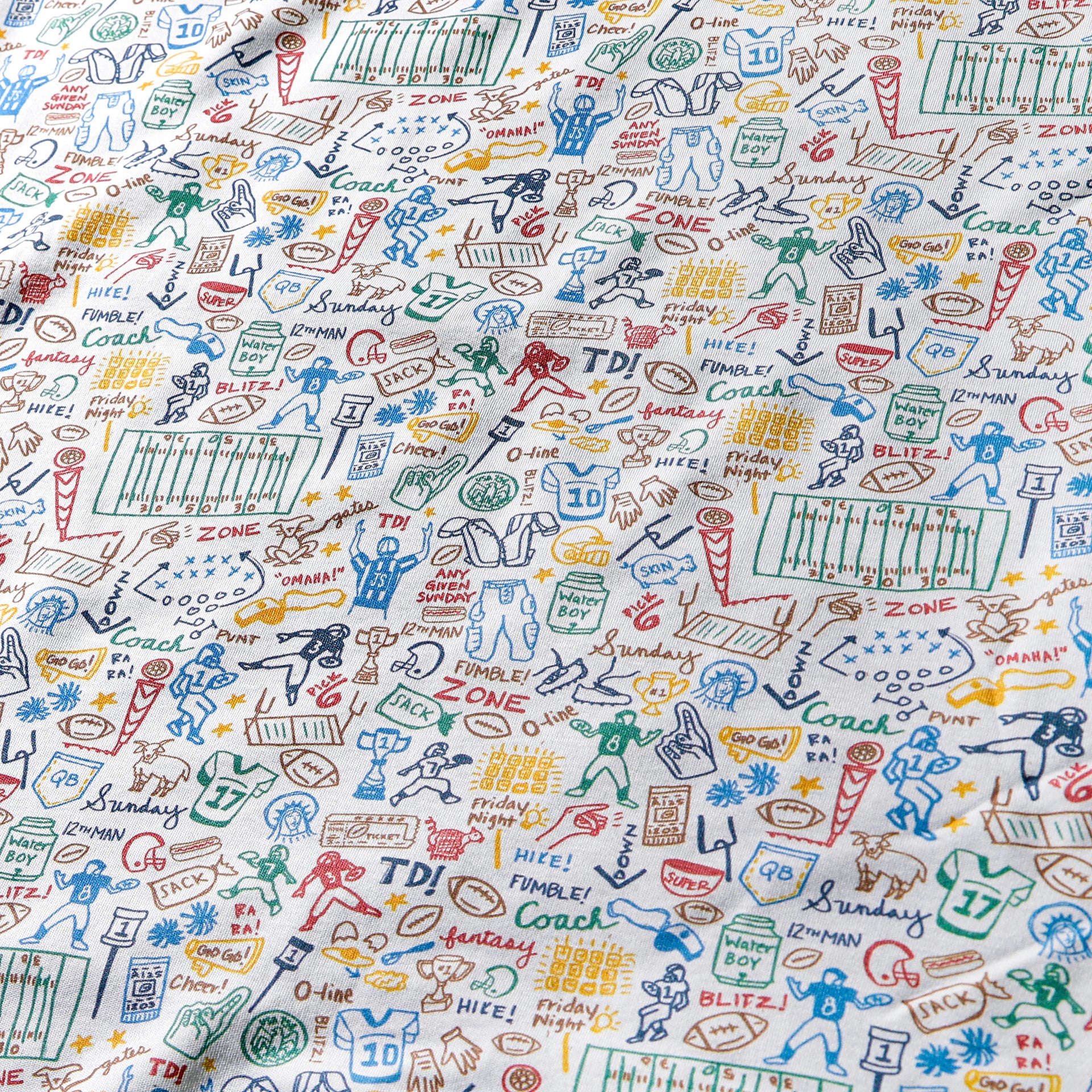 Introducing our Football Print – a playful mix of footballs, helmets, goalposts, and game-day details that celebrate the fun of the sport! With a sporty striped trim detail, this collection is sure to spark JOY at bedtime.