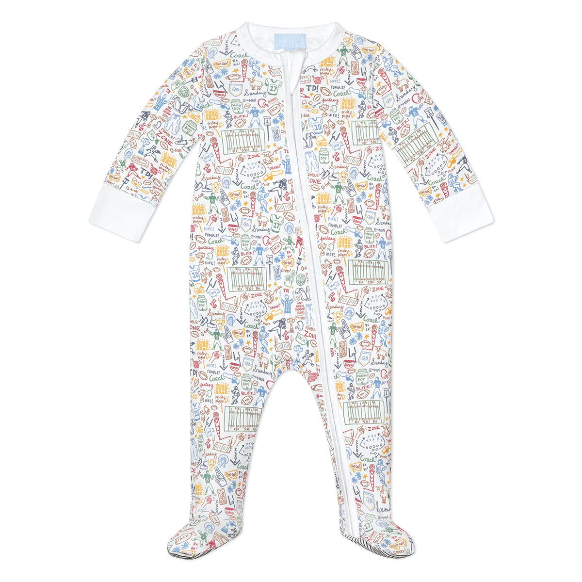 Our Football print zip baby onesie features all of our favorite game-day icons. From footballs and helmets to goalposts and snacks, this playful print celebrates everything we love about the sport!