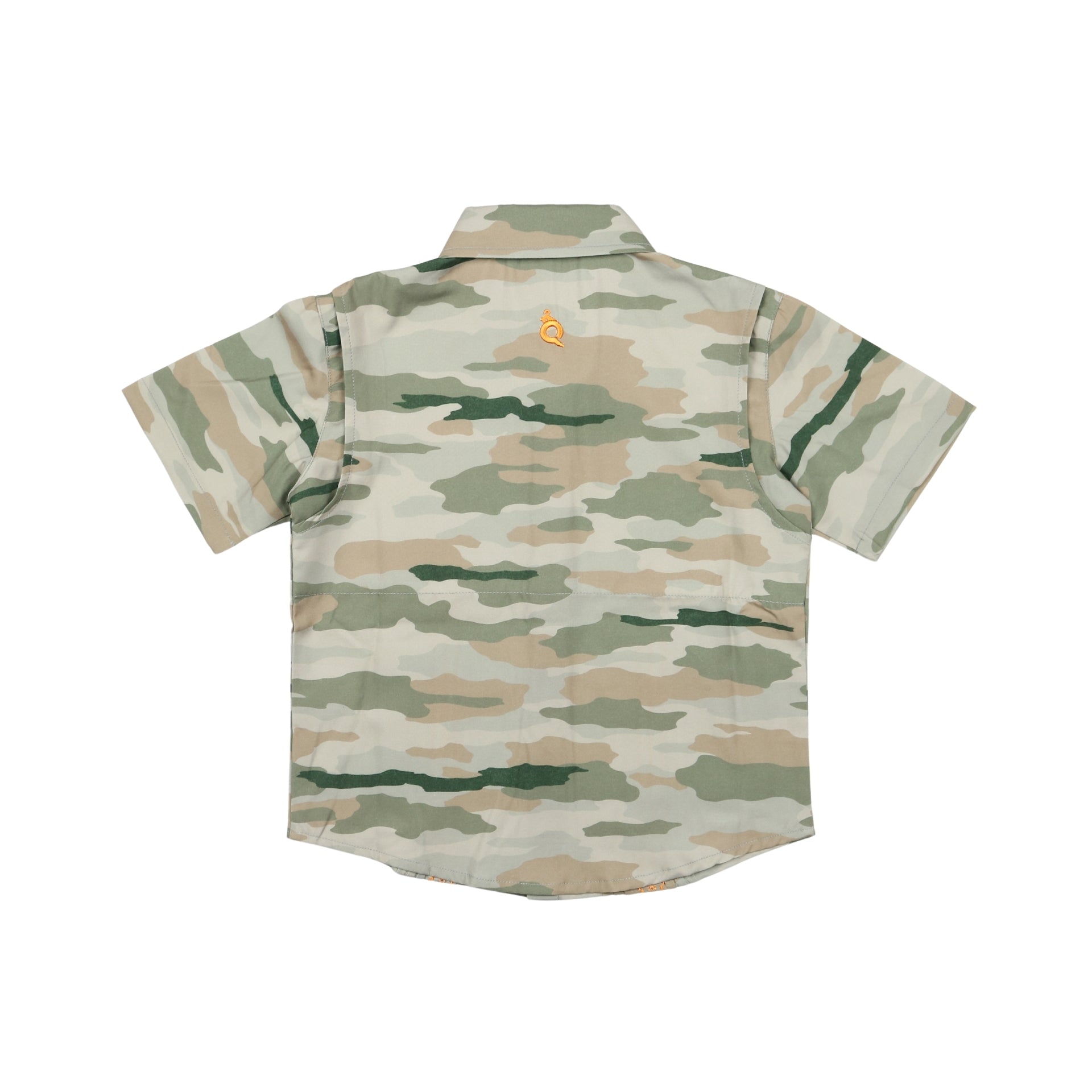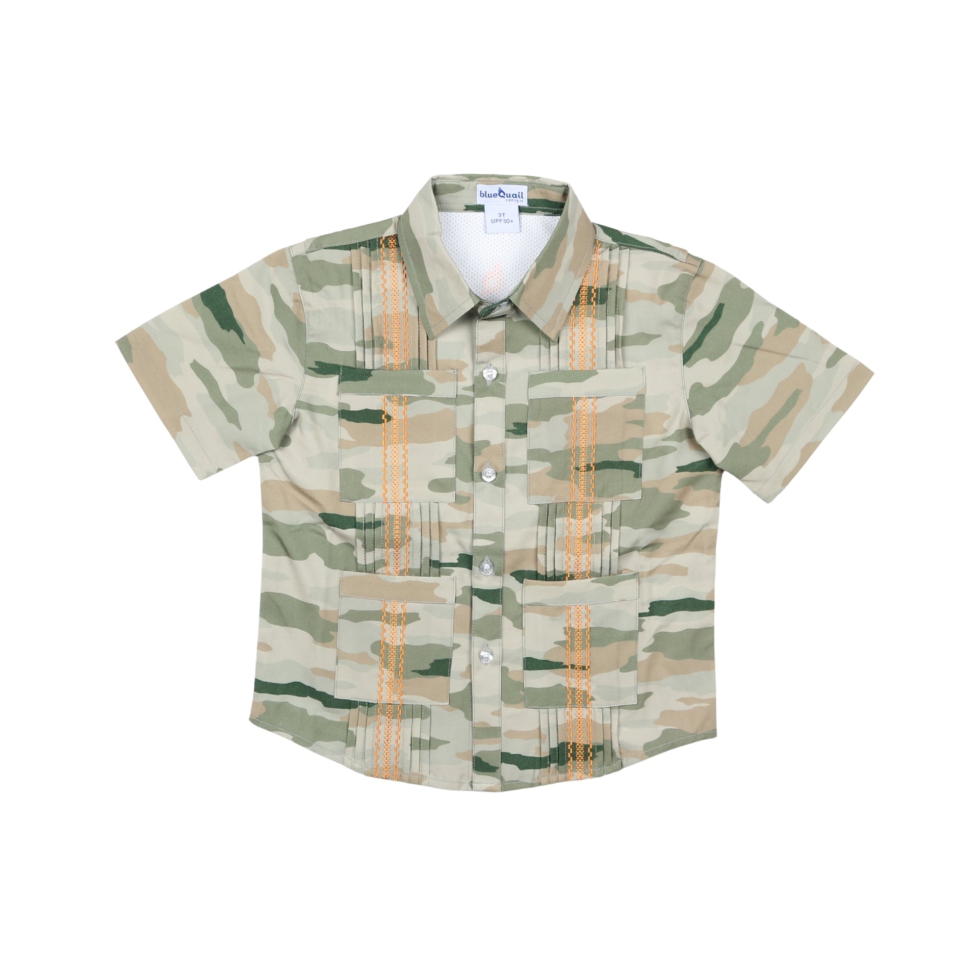 A classic camo patterned Guayabera made by bluequail for boys.