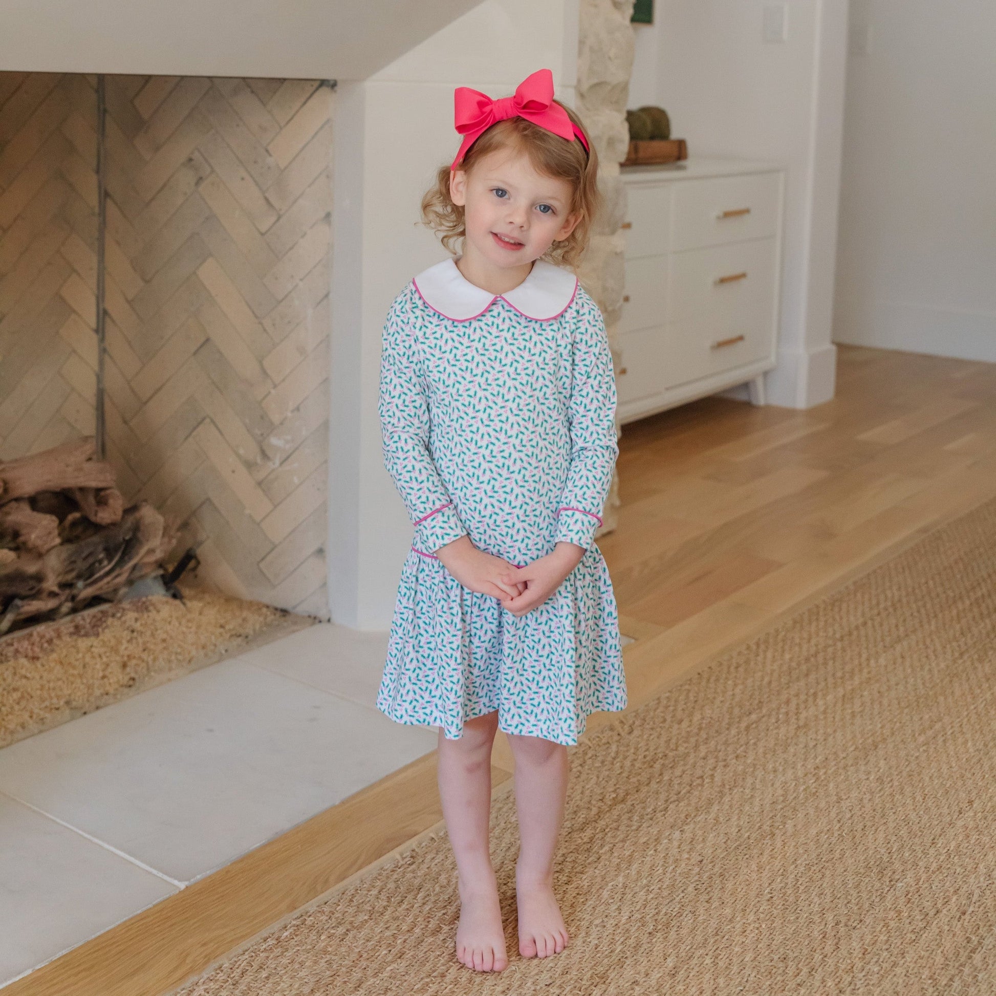 Long sleeve pima cotton dress with peter pan collar and contrast piping. Drop waist ruffle skirt.