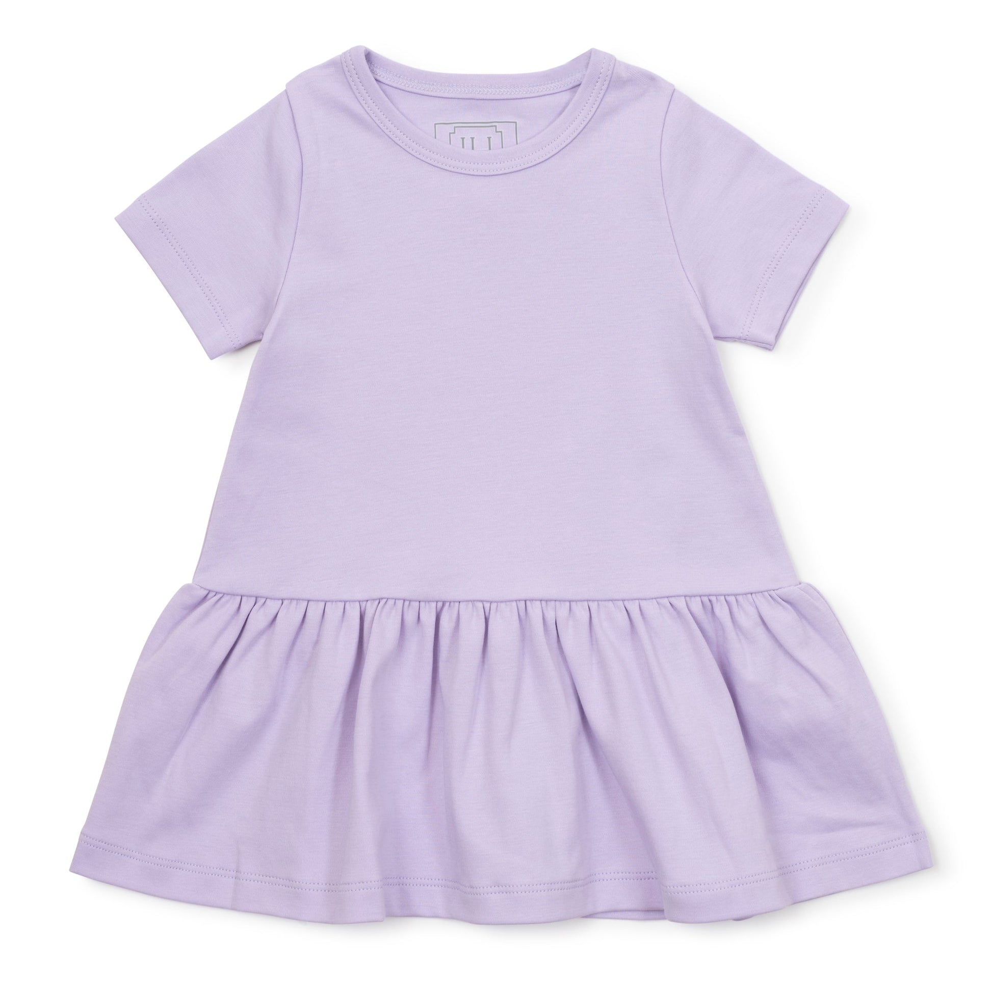 Girls' short sleeve t-shirt dress with dropped waist and flutter skirt. Made from 100% Peruvian Cotton.