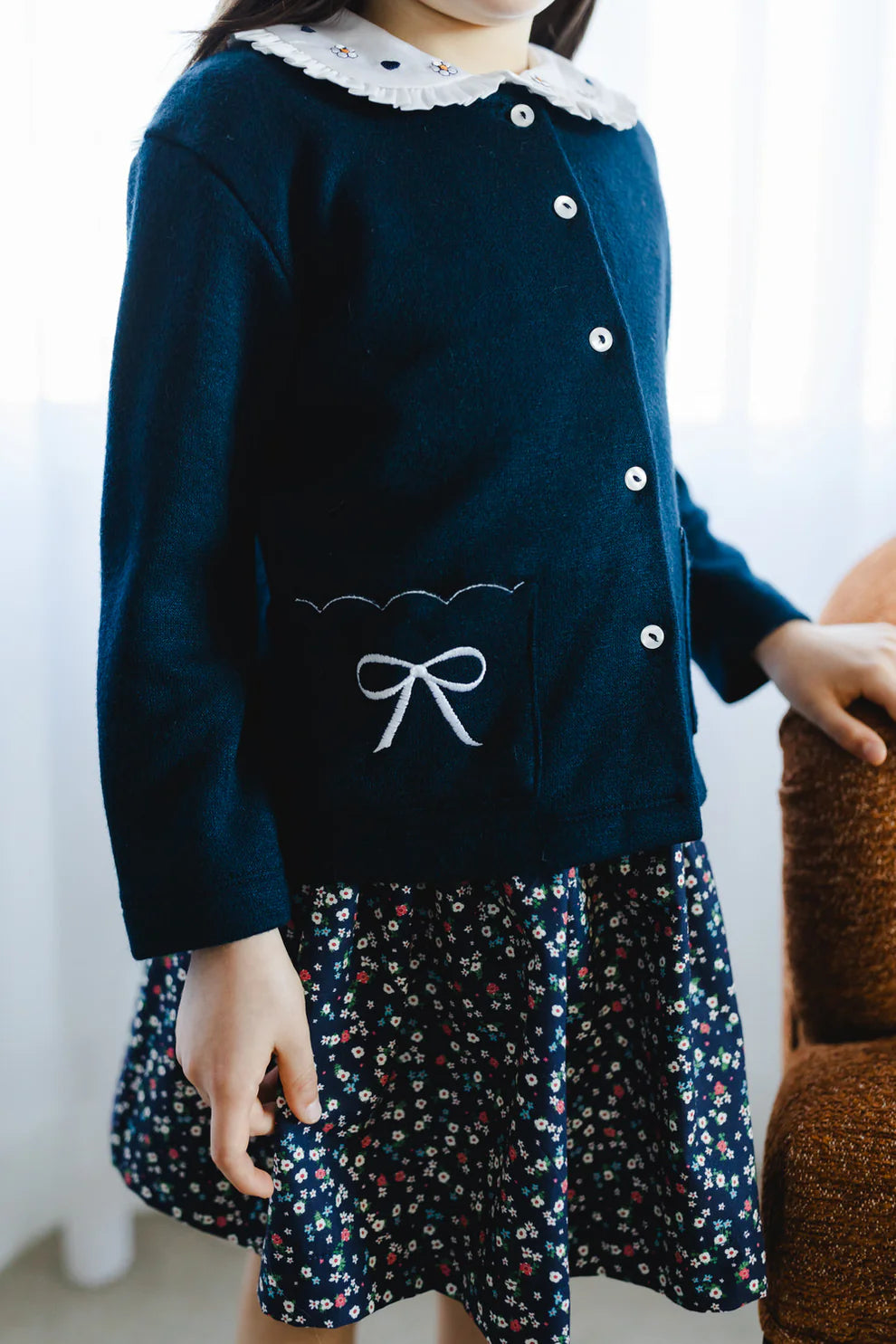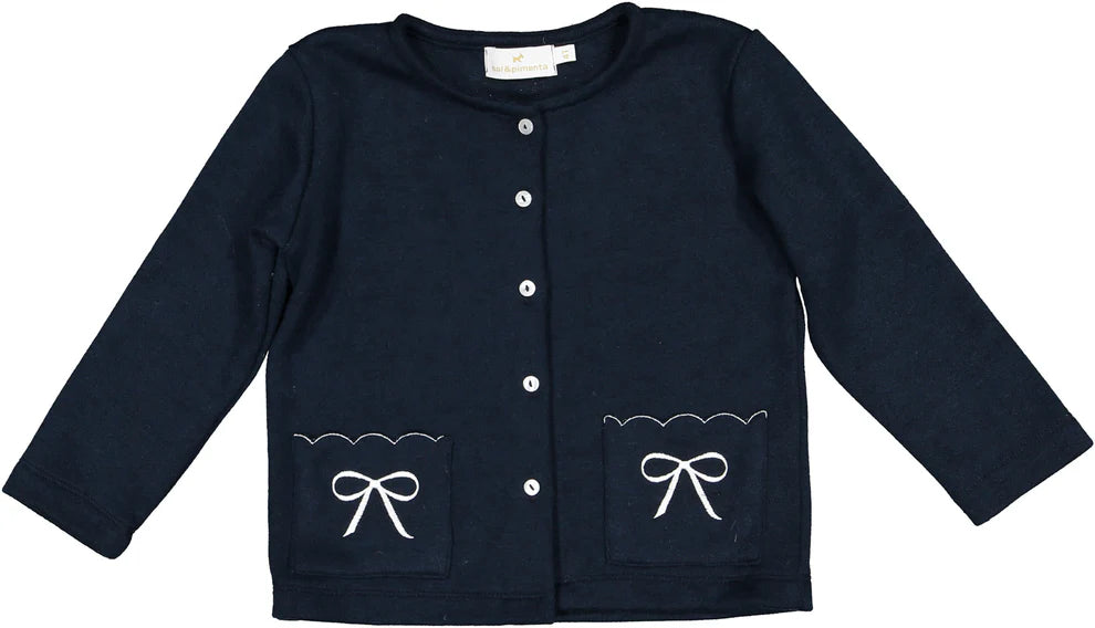 Navy Pocket Bows Cardigan made by Sal and Pimenta.