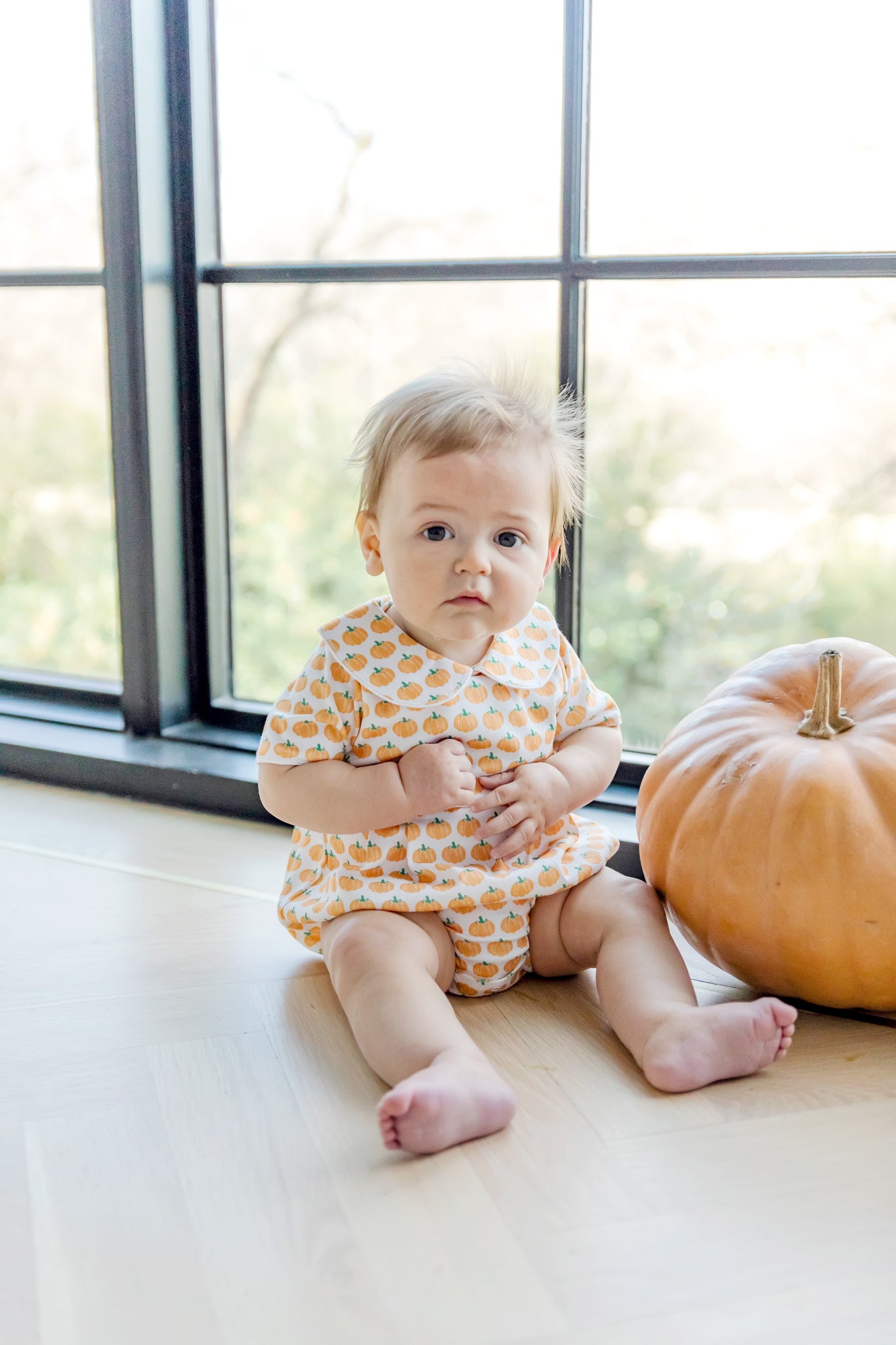 Boys' peter pan collar short sleeve pima bubble. Contrast piping on collar, sleeve and waist. Button closure in back and three snaps in the stride. Made from 100% Peruvian Cotton.