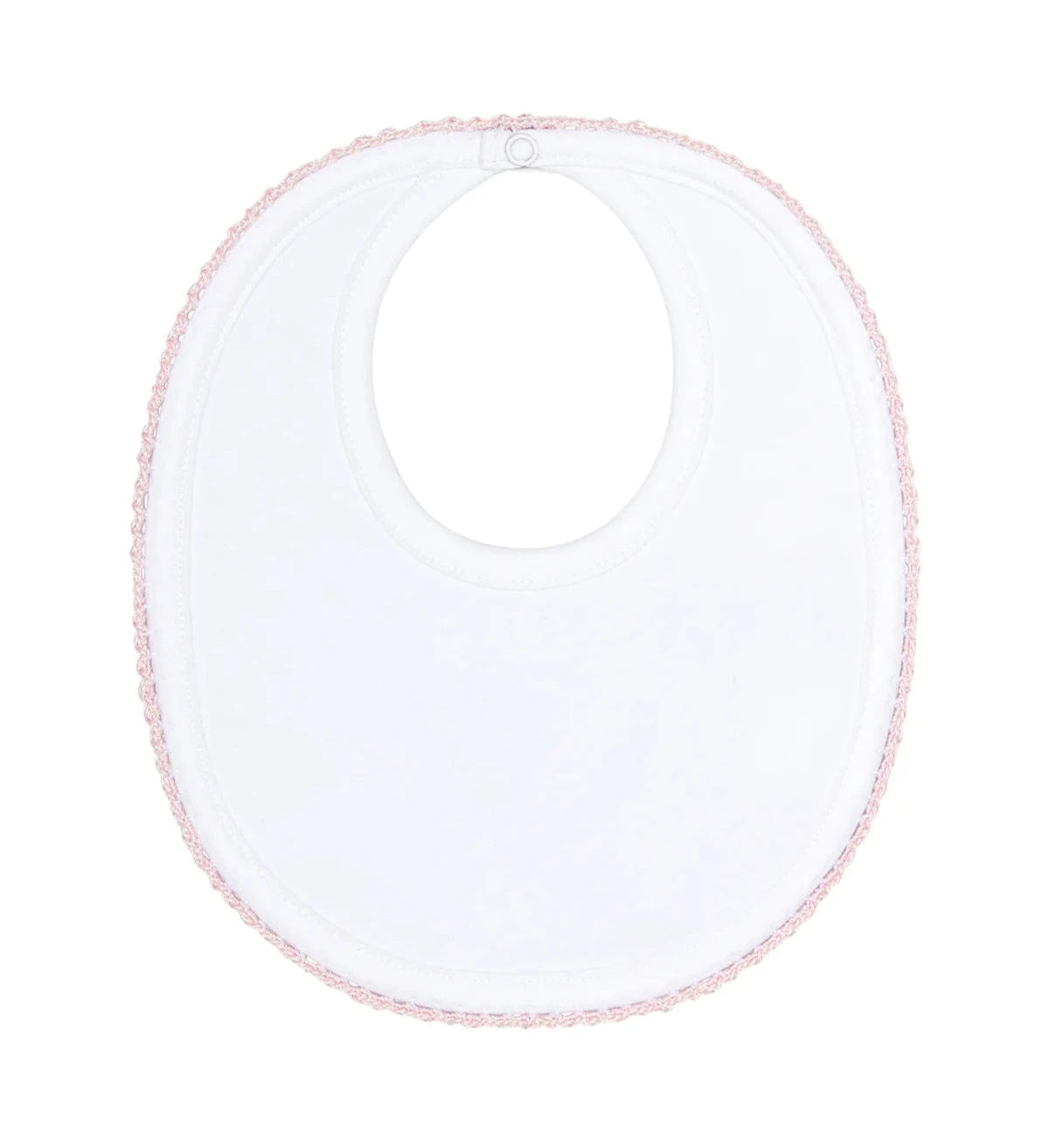 Elevate your baby's mealtime with our Crochet Pink Baby Bib, crafted from the finest pristine white Pima cotton. This bib offers exceptional softness and durability, ensuring it remains gentle on your baby's delicate skin while standing up to daily use, and the handmade crochet trim around the edges enhances its overall appeal