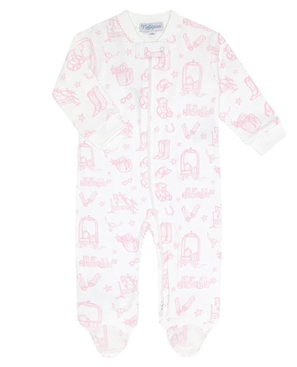 Wrap your baby in comfort and frontier flair with this zipper footie in our Lone Star Toile print. Crafted from 100% Peruvian Pima cotton, it’s ultra-soft and gentle on delicate skin. The 2-way zipper allows for quick and easy changes without fully undressing your little one — especially helpful during nighttime routines. Enclosed feet provide warmth and coziness, while the soft pink Western motifs add a touch of playful storytelling. A practical and beautiful piece for sleep or gifting.