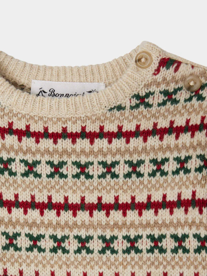 This Dalmire sweater for baby features a multicolored jacquard pattern, giving it seasonal charm. The buttons on the shoulder make it easy to put on.