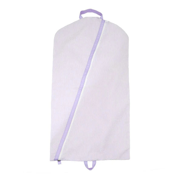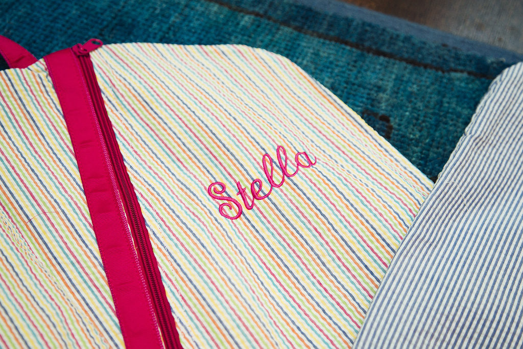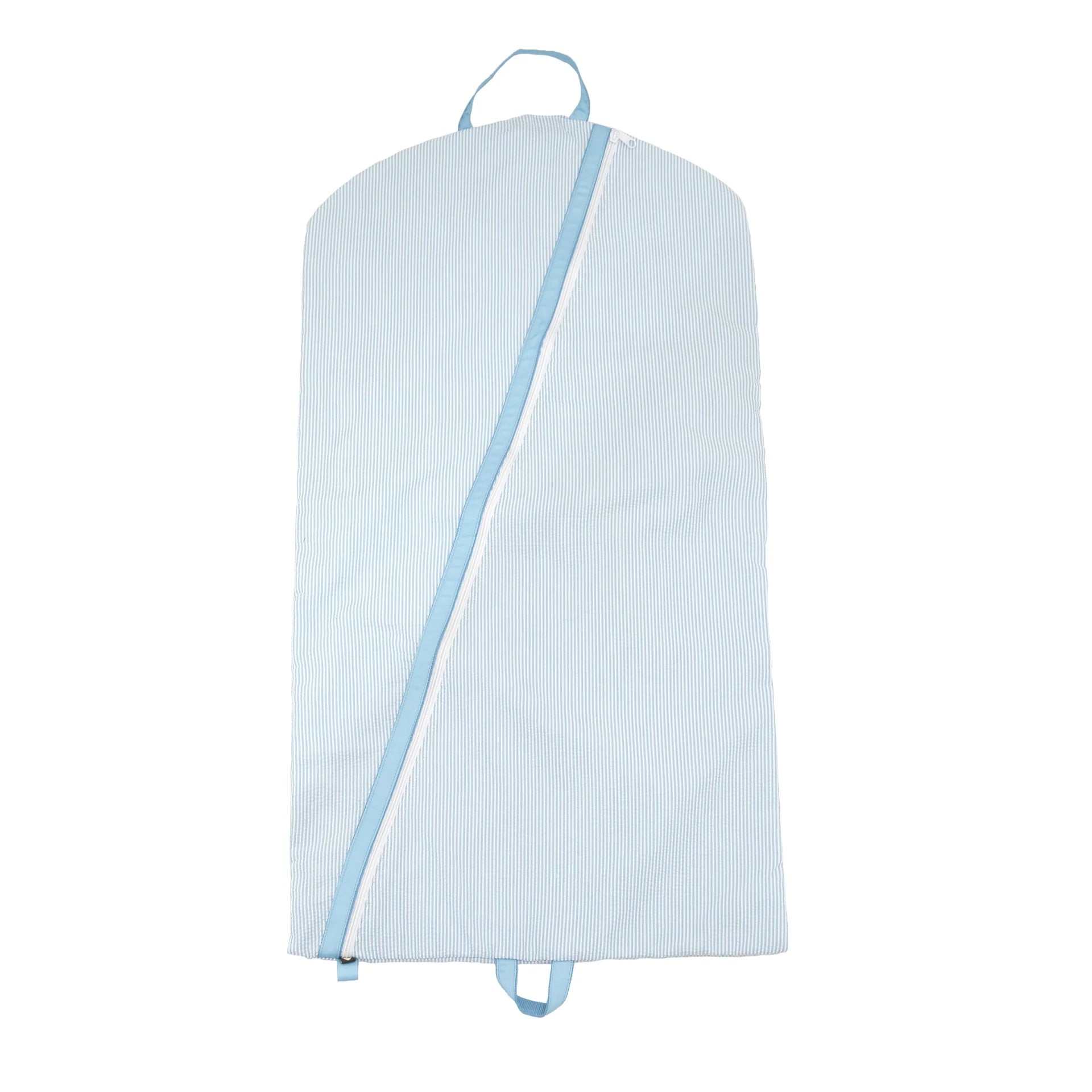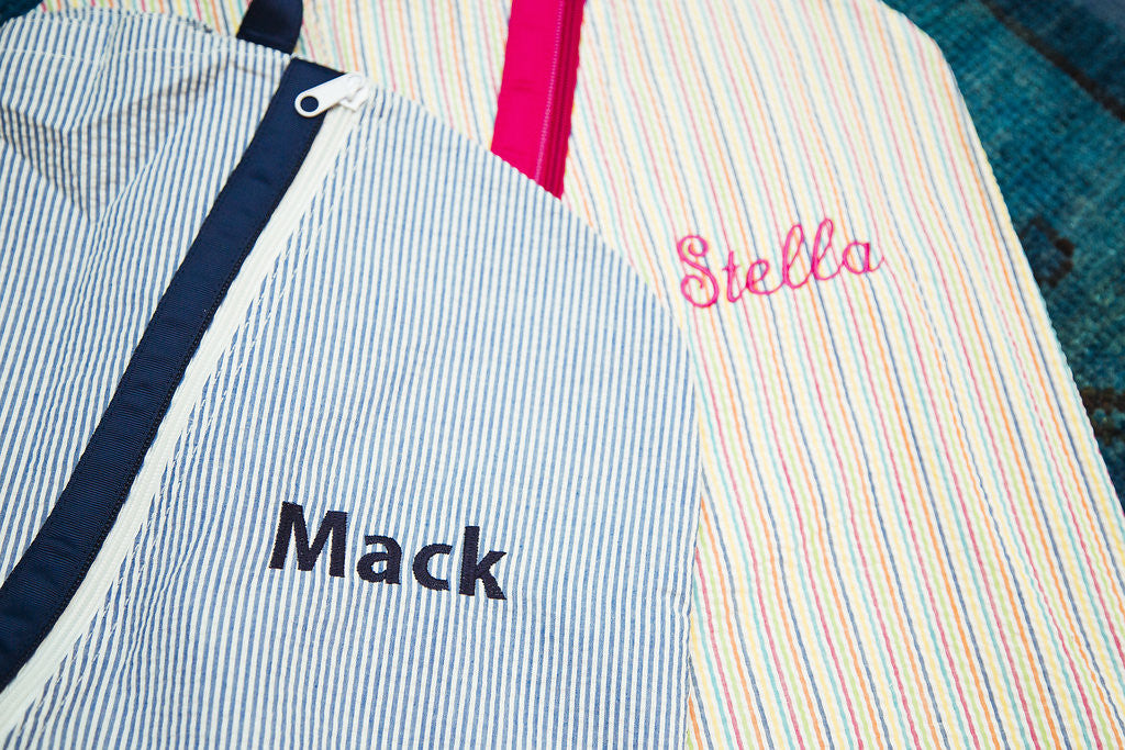From baby to teenager, this seersucker hanging garment bag is lined on the inside. It also looks rather cute monogrammed.