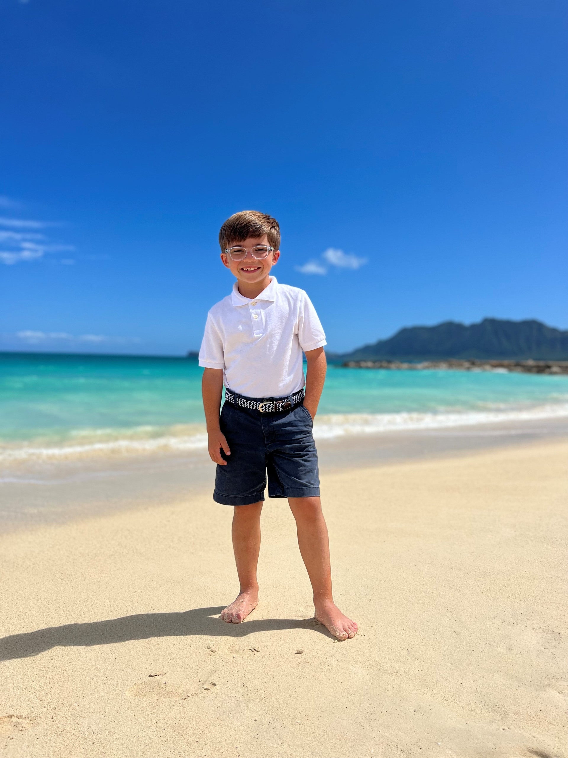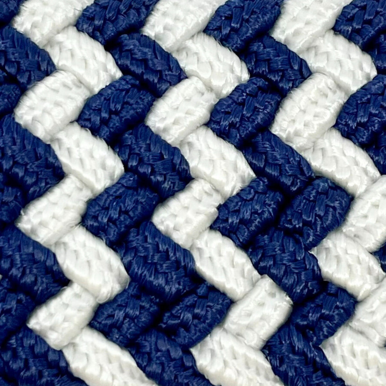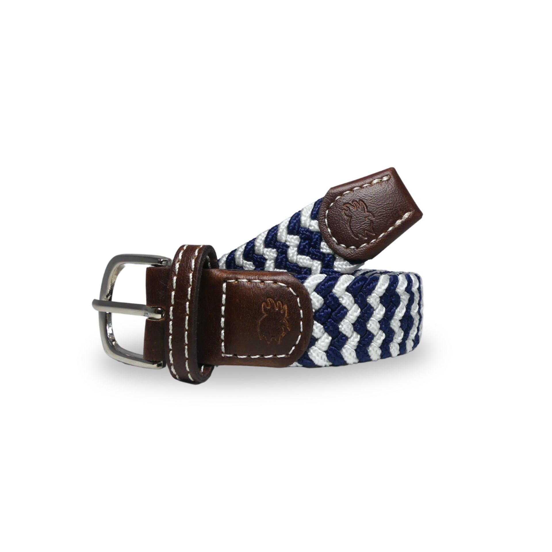 The Lil' Cape Cod kid's chevron woven stretch belt. Navy and white belt with a rounded buckle and dark brown leather finish stamped with the Roostas logo. An adjustable clasp goes through the woven belt, allowing for adaptable sizing. Designed for comfort both on and off the course.